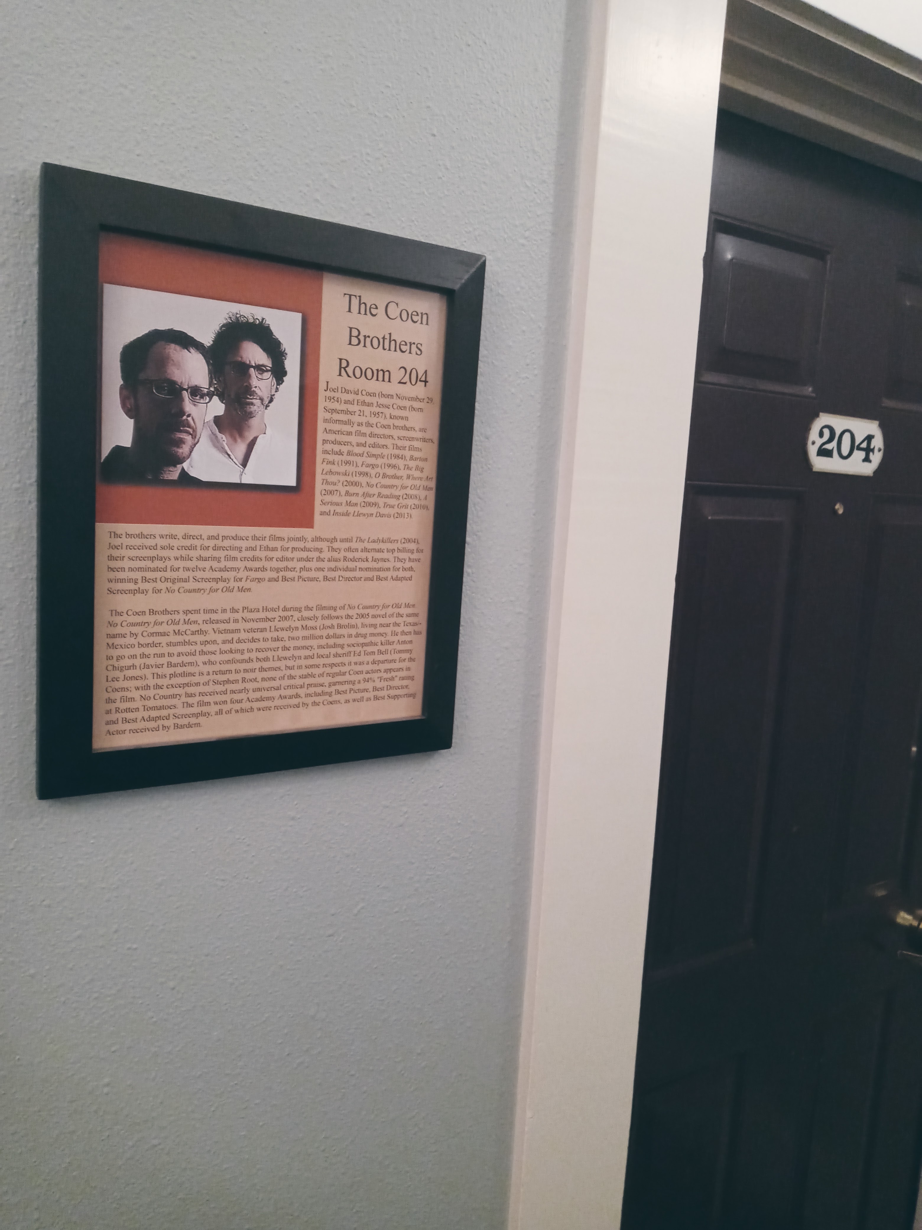 The hotel was our main reason for stopping here. The historic hotel is still priced reasonably, has a café, a nice bar in the fine-dining restaurant, a coffee bar, and a lobby selling local wares. When you walk in, there stands a staircase where Javier Bardem’s hitman confronts Woody Harrelson’s bounty hunter. Many of the rooms have signs explaining who stayed there during which production, including President Roosevelt, the Coen Brothers, Patrick Swayze, James Woods, and dozens more.